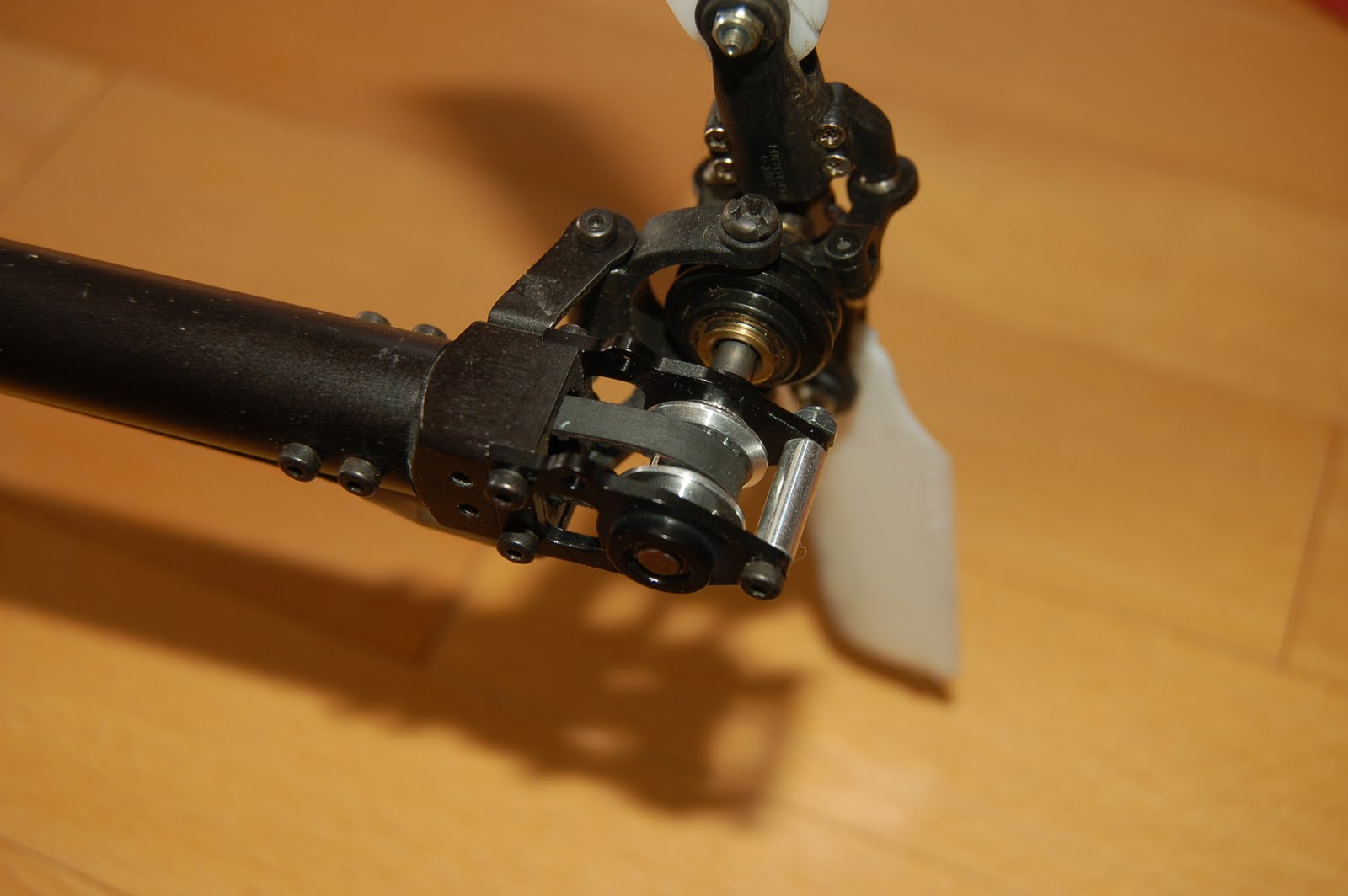 Angefangen habe ich mit dem vorderen Riemenrad. Dazu habe ich die Hebel von der Taumelscheibe ausgeklipst, die Schaube durch die Hauptrotorwelle ausgedreht und den kompletten Rotorkopf nach oben rausgezogen. Das Ersetzen des Riemenrades war absolut problemlos.