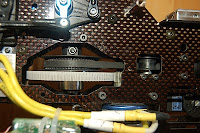Doch nach dem Zusammenbau stand ich vor einem Problem: durch das größere Riemenrad schleift der Riemen am Chassis! Wegschleifen der störenden Aussparung an den Seitenplatten war kein Problem. Erneuter Einbau sah dann erst mal ganz gut aus. Aber weit gefehlt. Das neue Riemenrad hat zu viel Abstand zum Hauptzahnrad und ausserdem ist der untere Rand deutlich dicker. Dadurch läuft der Riemen nicht mehr sauber auf dem Rad. Das würde im Flug nicht lange gutgehen. Also hatte ich beschlossen, das Riemenrad so zu modifizieren, dass es tiefer kommt. Auch das war kein Problem, doch nun passt die Position des Lochs für die Schraube durch die Hauptrotowelle nicht mehr. Bei den Versuchen, das passend zu machen, beschädigte ich alledings das Riemenrad so stark, dass ich es nicht mehr einsetzen konnte. Ich habe bereits eine neue Bestellung offen und sobald das neue Riemenrad da ist