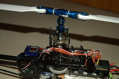 Ich habe einfach alle Teile, die mit dem Paddel zusammenhängen weggebaut und die Blattgriffe der Blätter direkt mit der Taumelscheibe über lange Anlenkgestänge (Zentrum zu Zentrum 68mm) verbunden. Die Blattgriffe sind lang genug, aber man braucht Distanzstücke von 9mm Länge (mit M2.5 Gewinde durchgebohrt), um mit der Anlenkung auf die Achse der Hauptrotorwelle zu kommen. Die Anlenkgestänge selbst sind aus M2 Gewindestange, über die ich jeweils ein Röhrchen aus CFK drüber geschoben habe. Das Röhrchen ist nötig, weil die Gewindestange sonst auf diese Länge zu labberig wäre. Den Pitch-Kompensator habe ich belassen, weil er als TS-Mitnehmer dient. Damit er nicht aus der Führung rutscht, habe ich anstatt der oberen Kugelköpfe zwei lange Schrauben als Beschränkung eingedreht. Das sieht vielleicht etwas komisch aus, funktioniert aber gut.