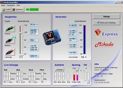 Die Anlenkungen der PushPull-Mechanik für die TS-Servos müssen auf die innersten Löcher, damit die TS mit dem Pitchkompensator nicht anstößt und ca. 13° Pitch erreicht werden. Die Stangen sind dann zwar nicht mehr parallel, das ist aber kein Problem, wie man auf dieser Seite eindrucksvoll sehen kann. Die von mir verwendeten Servos Futaba S3150 Digital scheinen von der Geschwindigkeit und Stellkraft auszureichen. Der VStabi-Performance-Rechner bescheinigt mir 900Punkte.