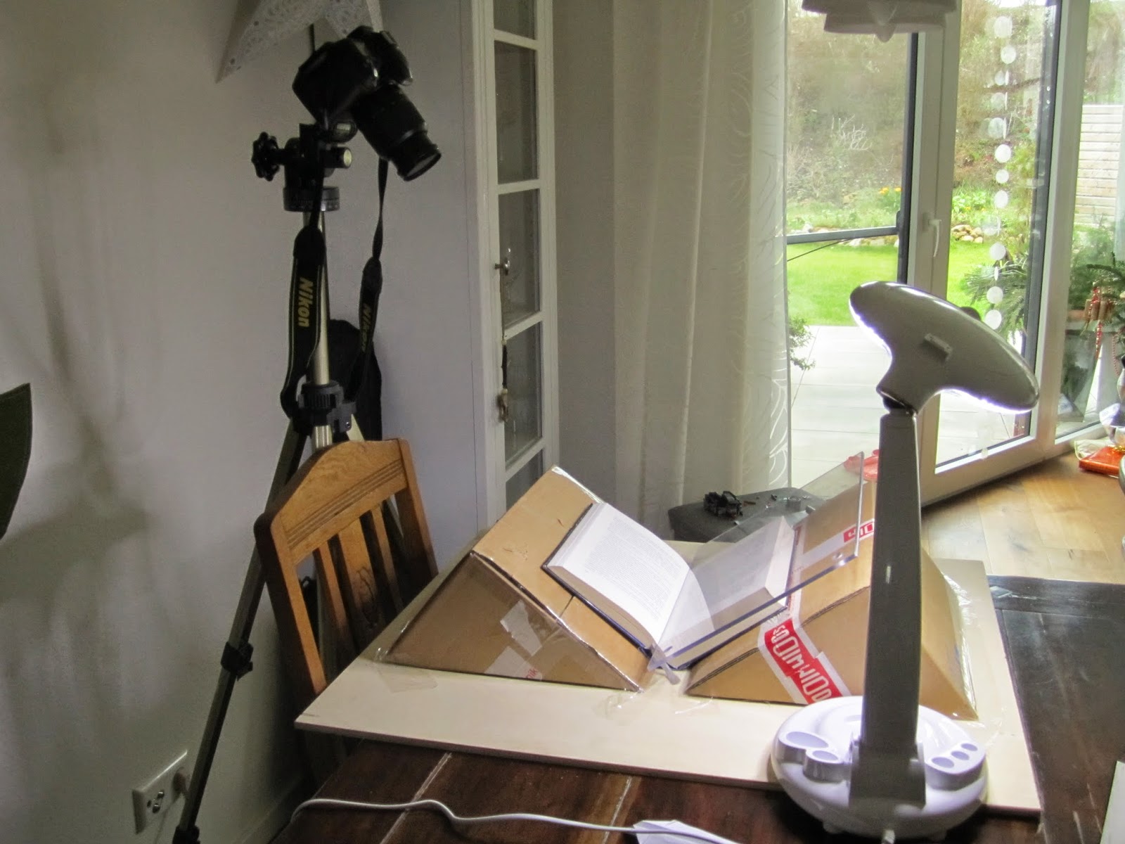 Zunächst habe ich den Versandkarton ringsum zugeklebt, so dass ich eine geschlossene Pappkiste hatte. Diese habe ich dann mit dem Cutter diagonal von unten nach oben aufgeschnitten, so dass 2 offene Hälften entstanden. Nun noch ein bisschen die losen Lappen innen festgeklebt und fertig sind die Buchstützen. Diese klebte ich nun mit dem Paketklebeband so auf das Bodenbrett, dass zwischen Beiden etwa 3cm Platz für den Rücken des Buches bleibt. So ist sichergestellt, dass, wenn das Buch aufgeklappt auf der Stütze liegt, die Seiten einigermaßen flach liegen. Das ist wichtig, damit beim fotografieren der Buchseiten keine Verzerrungen entstehen. Die Buchstütze ist nun fertig und liegt auf dem Tisch in Arbeitshöhe. Daneben stelle ich das Stativ mit aufgeschnallter Kamera, die Beleuchtung kommt von der Seite, so dass keine Schatten auf die abzufotografierende Buchseite geworfen werden.