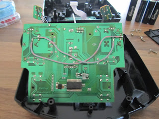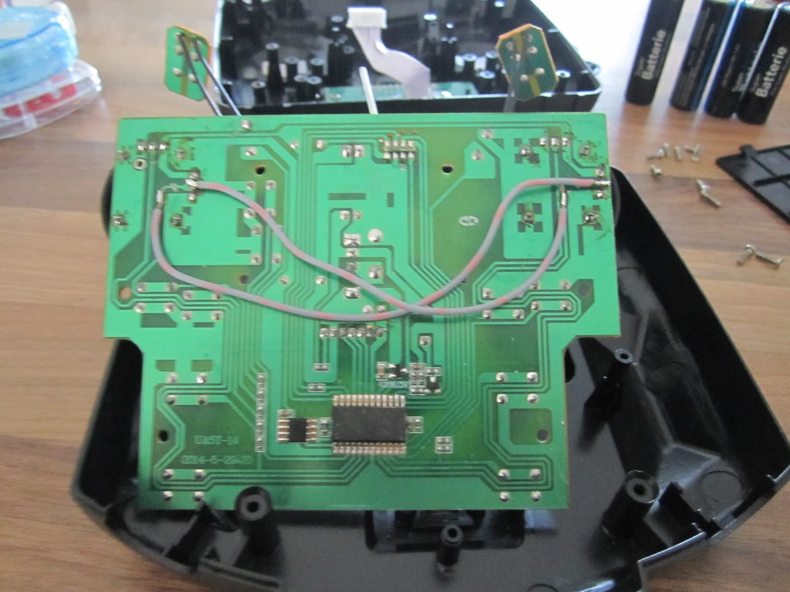 Ein erster Blick in’s Innere der Funke offenbart eine übersichtliche Elektronik. Die Federn in den Knüppelaggregaten lassen sich leider nicht entfernen, es sind fest verbundene Potis für die X- und Y-Achse. Also musste ich die Aggregate auslöten, um sie an der anderen Position wieder einzulöten. Die eine Funktion, die vertauscht ist, lötete ich kurzerhand um. Hier ist das Design zum Glück sehr übersichtlich. Einfach die Leitungen für den Mittelpin des Potis and die andere Seite legen. Das wird auch für die anderen Modis funktionieren. Exoten mit vertauschten Knüppelrichtungen gehen natürlich nur mit größerem Aufwand.