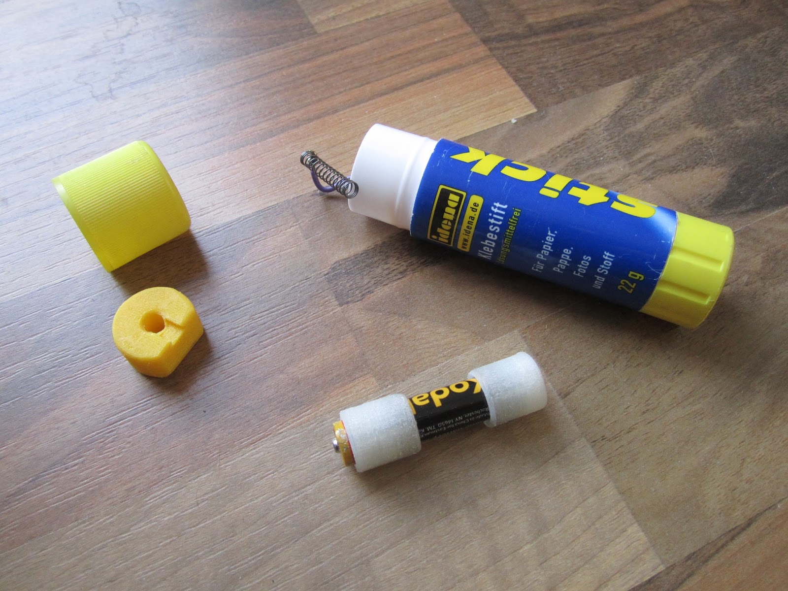 Die Batterie im Bild ist übrigens eine AAA mit 2 selbstgedruckten Ringen als Adapter zu AA.